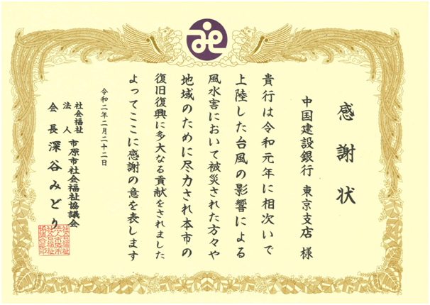 千葉県市原市社会福祉協議会より感謝状を頂きました